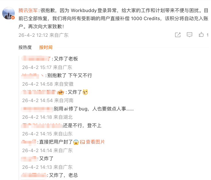 又有不少用户留言反馈称该服务又炸了、又崩了等,腾讯云官方微博今日中午发文称,将为受影响用户补偿1000 Credits。