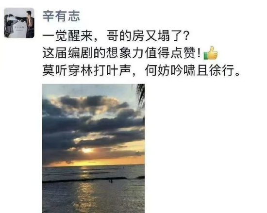 对此,昨日晚间,辛巴自己也在朋友圈发文称,“一觉醒来,哥的房又塌了?这届编剧的想象力值得点赞!莫听穿林打叶声,何妨吟啸且徐行。”