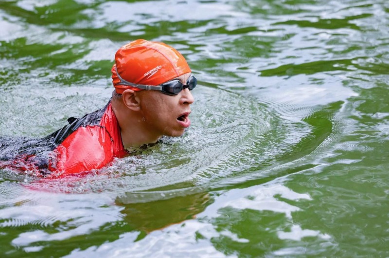 当天中午,张朝阳先在北京奥林匹克森林公园慢跑5公里,激活身体状态。下午他又来到颐和园外河道游泳1小时,期间他来回切换蛙泳、自由泳、仰泳不同姿势,有节奏地蹬腿、换气,超速度完成了训练任务。他表示,今天游得很快,都是小时候在家乡灞河学的童子功。