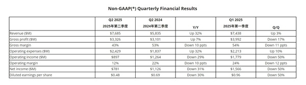 数据显示,AMD Q2季度营收达到77亿美元,同比增长32%,超出分析师先前预期的74.3亿美元。运营利润率为40%,较去年同期下降10个百分点,这主要是由于MI308加速卡出口禁令的影响。