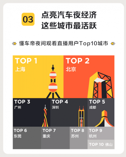 同时,夜间看播活跃度和城市经济发展水平呈正相关。懂车帝夜间直播活跃用户数排名前十城市包括上海、北京、广州、深圳、成都等,与京津冀、长三角、粤港澳三大经济圈和成渝经济圈的核心城市高度契合。