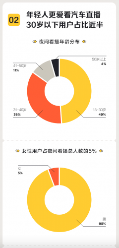 数据显示,年轻男性用户是观看夜间汽车直播的主力军。从8月数据看,30岁以下的年轻用户占比近半,但50岁以上也有4%;看播用户中男性占比达95%,女性为5%。在懂车帝新车选买、二手车、汽车文化与车后知识等全量直播内容吸引下,意在选买汽车的无车看播用户占比达39%,已经有车但也喜欢在直播间看、逛、聊的用户有27%。