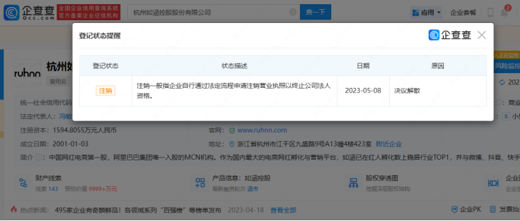 据企查查APP显示,杭州如涵控股股份有限公司工商经营状态由存续变更为注销。从一时风光无二的网红电商第一股,到现在疑似注销。当然了,具体情况如何我们或许还应该静待官方消息,只不过如涵从上市到退市的遭遇已经足以令人感到唏嘘了。