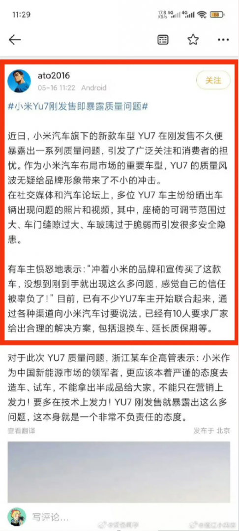 小米YU7未发先被黑 网上已现质量维权贴 要求退车汽车