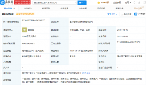 【TechWeb】企查查APP显示,8月9日,重庆智维忆想科技有限公司成立,法定代表人为香文斌,注册资本1000万元人民币,经营范围包含:平面设计;信息技术咨询服务;云计算装备技术服务;软件销售等。