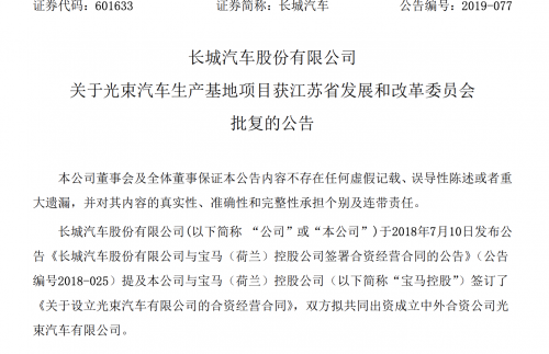 【TechWeb】11月23日,长城汽车发布公告称,光束汽车生产基地项目已经获得江苏省发展和改革委员会的批复。