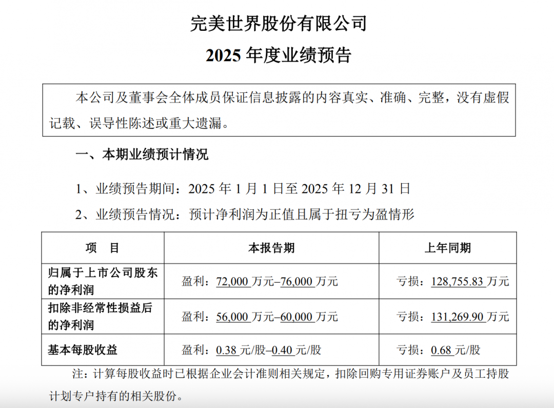 完美世界:预计2025年归母净利润超7亿元 同比扭亏为盈快讯