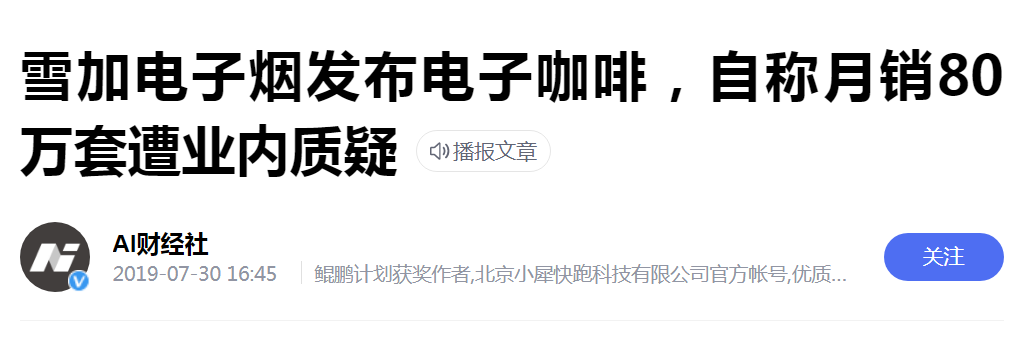 产品方面,雪加曾发布过“电子咖啡”,可将含有咖啡提取物的咖啡弹雾化供消费者吸食。电子咖啡发布后随即引发大量质疑,电子咖啡是否含有国家管制药物咖啡因?咖啡以雾化方式被吸入体内,是否存在未知的健康风险?雪加虽然此后进行了公开回应,但并非浇灭全部质疑。