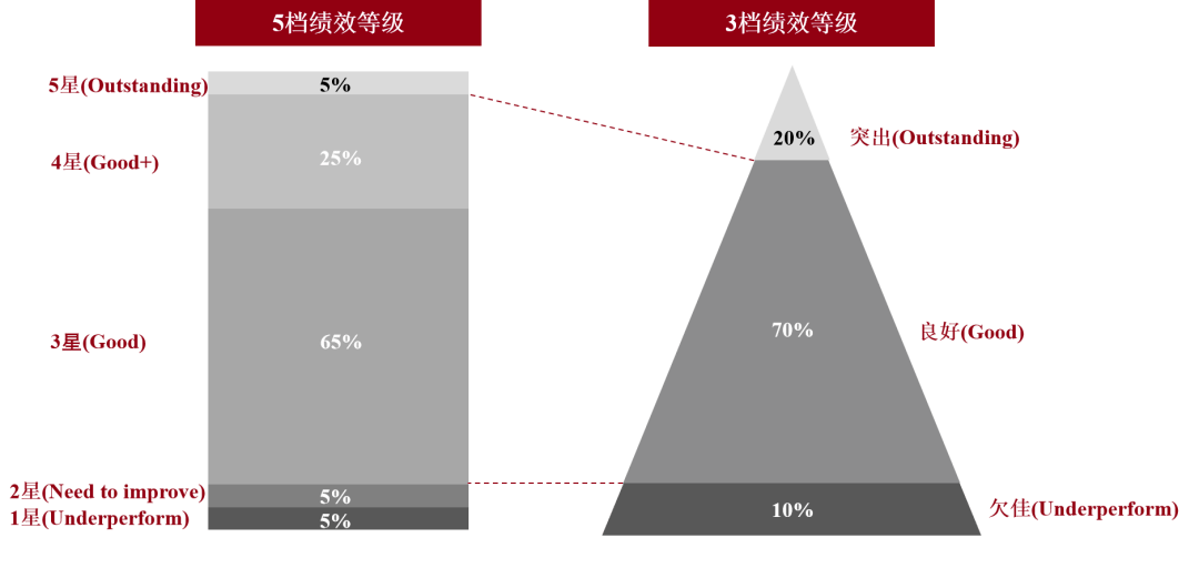 在过去的五星评价中,腾讯的4星与5星名额很少,5星很难用到,而1星与2星这种低绩效比高绩效的更少,管理者一般会给员工留面子也不会轻易打1星。简化成3档后,1星和5星这两种几乎无效的评级就被直接省略掉了。