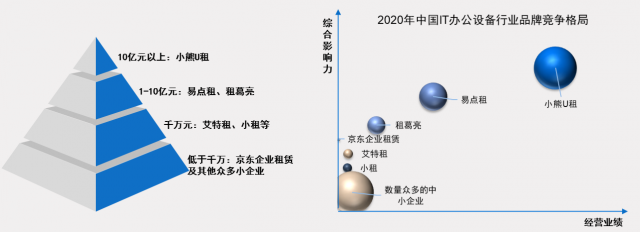 报告显示,尽管IT办公设备运营行业进入门槛低,但受限于资金、技术等原因,目前国内大部分企业规模普遍偏小,年营收超过10亿元的仅有小熊U租一家,其综合影响力远超企业行业竞品,整个行业营收上亿的企业更是屈指可数,大部分企业年营收不足千万元。