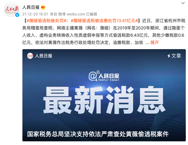 值得注意的是,在处罚通知之前,有网友就发现,薇娅的微博已经停更2天,上一条微博还是在12月18日。与此同时,根据企查查公开信息显示,薇娅夫妇合伙企业也已注销,对此网友表示一切都有迹可循。