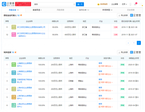 企查查 App显示,目前薇娅(本名黄薇)共关联18家企业,在12家公司担任法定代表人职务。2021年7月、8月,薇娅接连注销2家公司,此前薇娅夫妇合资公司杭州谦壹企业管理合伙企业(有限合伙)发生工商变更,经营状态变更为注销,目前薇娅控制企业共10家。