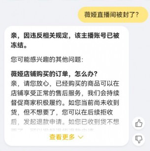 对此,淘宝客服表示,因违反相关规定,该主播账号已被冻结。紧接着,薇娅的微博和抖音等账号也都被封,这处理速度要远比雪梨和林珊珊还要快。