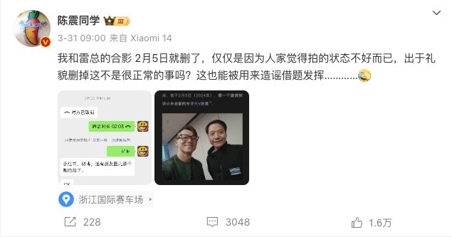 陈震表示,“和雷总的合影 2月5日就删了,仅仅是因为人家觉得拍的状态不好而已,出于礼貌删掉这不是很正常的事吗?这也能被用来造谣借题发挥……”