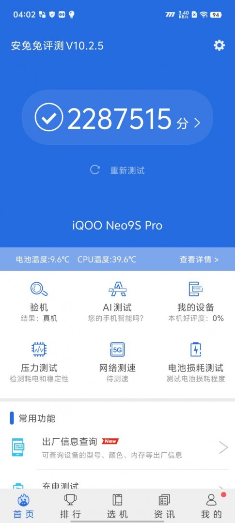 从结果来看,iQOO Neo9S Pro的安兔兔跑分达到了2287515分,是当前安卓阵营的最高分之一,实际使用起来自然也是非常流畅,即使重度性能玩家也能轻松满足其使用需求。