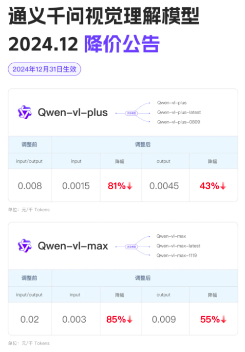 【TechWeb】12月31日消息,阿里云发布降价消息:本年度第三轮大模型降价,通义千问视觉理解模型全线降价超80%,最低仅需0.0015/千tokens。