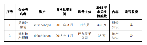 公告还透露了标的公司旗下公众号的运营状况。数据显示,截至2018年末,吴晓波频道关注粉丝数350万,巴九灵子公司“德科地产频道”关注粉丝数25万。