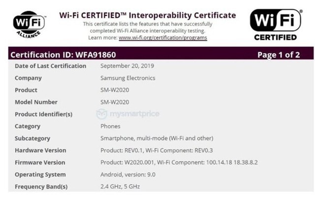 三星系列手机W20 5G将于11月正式发布,三星W20 5G正式官宣 众所周知,早在一个月之前就曾有一款疑似三星W2020手机的产品已经通过了WiFi联盟的认证。