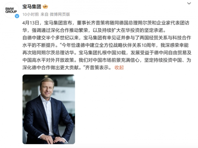 IT之家 4 月 14 日消息,宝马集团官微周六晚间发文宣布,董事长齐普策将随德国总理朔尔茨和企业家代表团访华,官方表示,此举将强调(宝马)通过深化合作推动繁荣,以及持续扩大在华投资的坚定承诺。据悉,德国总理朔尔茨一行将于 4 月 14-16 日期间对中国进行正式访问。