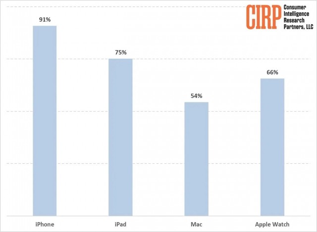 4 月 18 日消息,根据市场调查机构 Consumer Intelligence Research Partners(CIRP)公布的报告,调查上一季度购买过苹果产品的用户群体,发现 91% 拥有 iPhone、75% 拥有 iPad、66% 拥有 Apple Watch、54% 拥有 Mac 电脑。