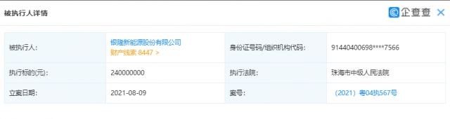 【TechWeb】企查查APP显示,8月9日,银隆新能源股份有限公司新增被执行人信息,案号(2021)粤04执567号,执行法院珠海市中级人民法院,执行标的2.4亿元。