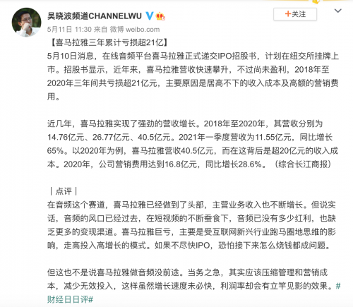 吴晓波频道官微曾发文称,“音频的风口已经过去,在短视频的不断蚕食下,音频已没有多少红利,也缺乏更多的变现渠道。喜马拉雅巨亏,主要是受互联网新兴行业跑马圈地思维的影响,走高投入高增长的模式。如果不尽快IPO,恐怕接下来怎么烧钱都成问题。”