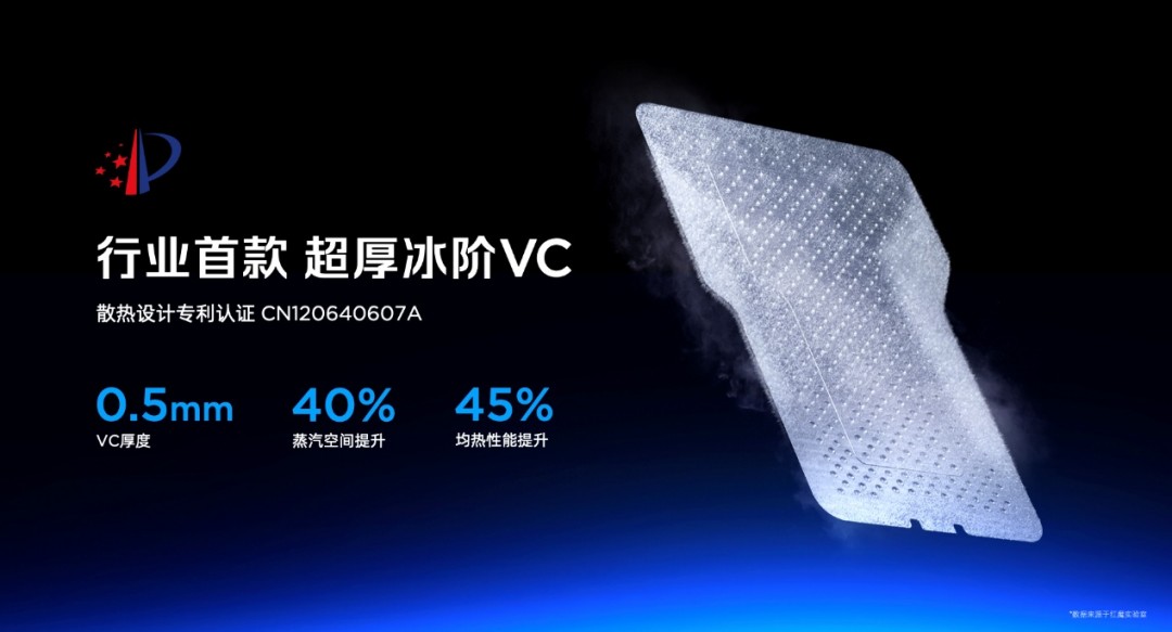 除了主动散热之外,红魔也带来了行业首款超厚冰阶VC,通过结构加厚与双面凸起设计,让蒸汽空间提升了40%,均热能力提升45%。同时也让VC均热板直触屏幕,散热效率提升了47%。