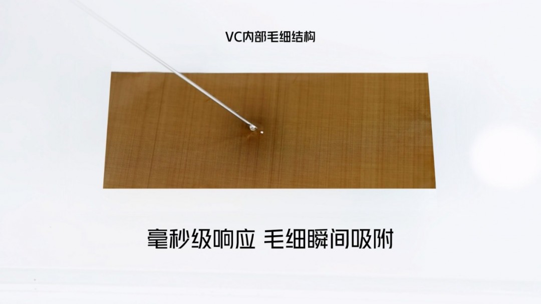 在发布会上,红魔也对VC均热板功能的优势进行了可视化呈现,演示视频中水滴滴在VC均热板之后,被瞬间吸附摊开,这也证明了该VC均热板的超强导热效率。