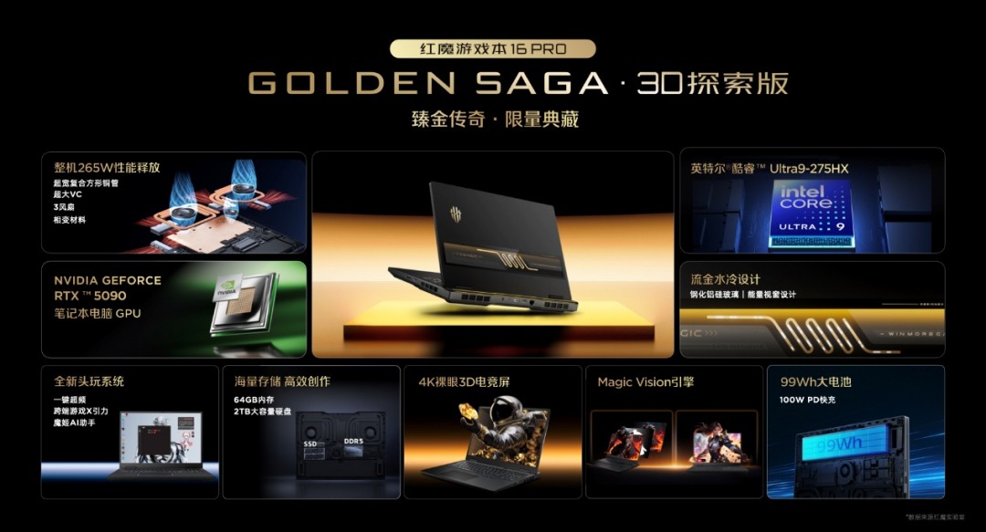 在游戏本上,红魔游戏本16 Pro全新升级GOLDEN SAGA•3D探索版,搭载英伟达5090显卡,拥有64GB+2TB存储,并且首次在笔记本上带来了流金水冷设计。