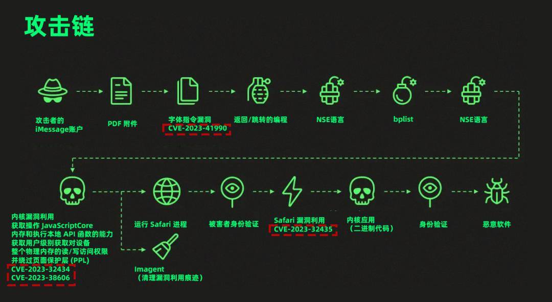 在整个过程中,前面提到的 4 个零日漏洞被充分利用,被攻击的手机只是因为接到了 iMessage 附件,甚至都还没打开,整个手机就已经连底裤都被扒光了。