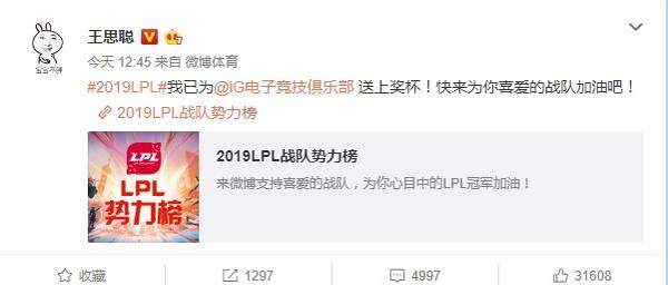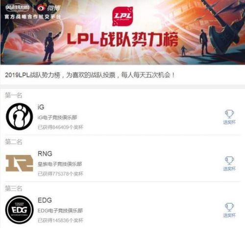 LOL新赛季的比赛已经打响,选手们也开始了新一年的较量。日前微博也开始了全新的战队势力榜投票活动,粉丝们可以给自己喜欢的战队投票送出奖杯,最后奖杯数量最多的战队就会获得年度最受欢迎人气战队的名号。