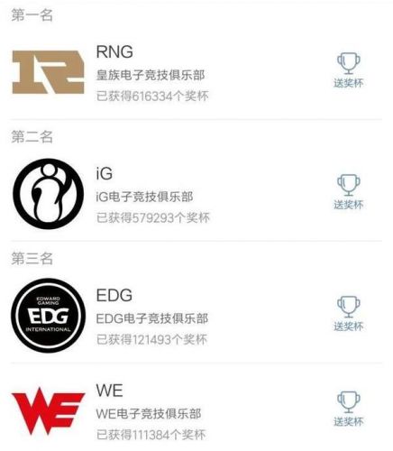 不过EDG与前两名战队的差距还是比较大的,于是很多粉丝看到身为冠军战队的IG竟然在票数上比不过RNG,所以人气战队榜首就成了IG与RNG的战争了。