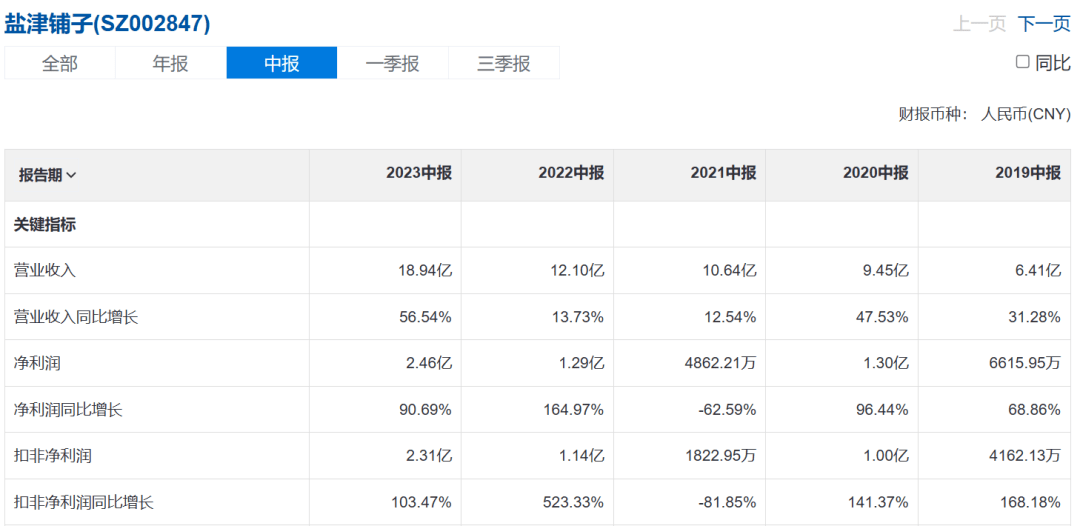 半年报显示,盐津铺子2023年上半年公司实现营业收入18.94亿元,同比增长56.54%;净利润2.46亿元,同比增长90.69%。