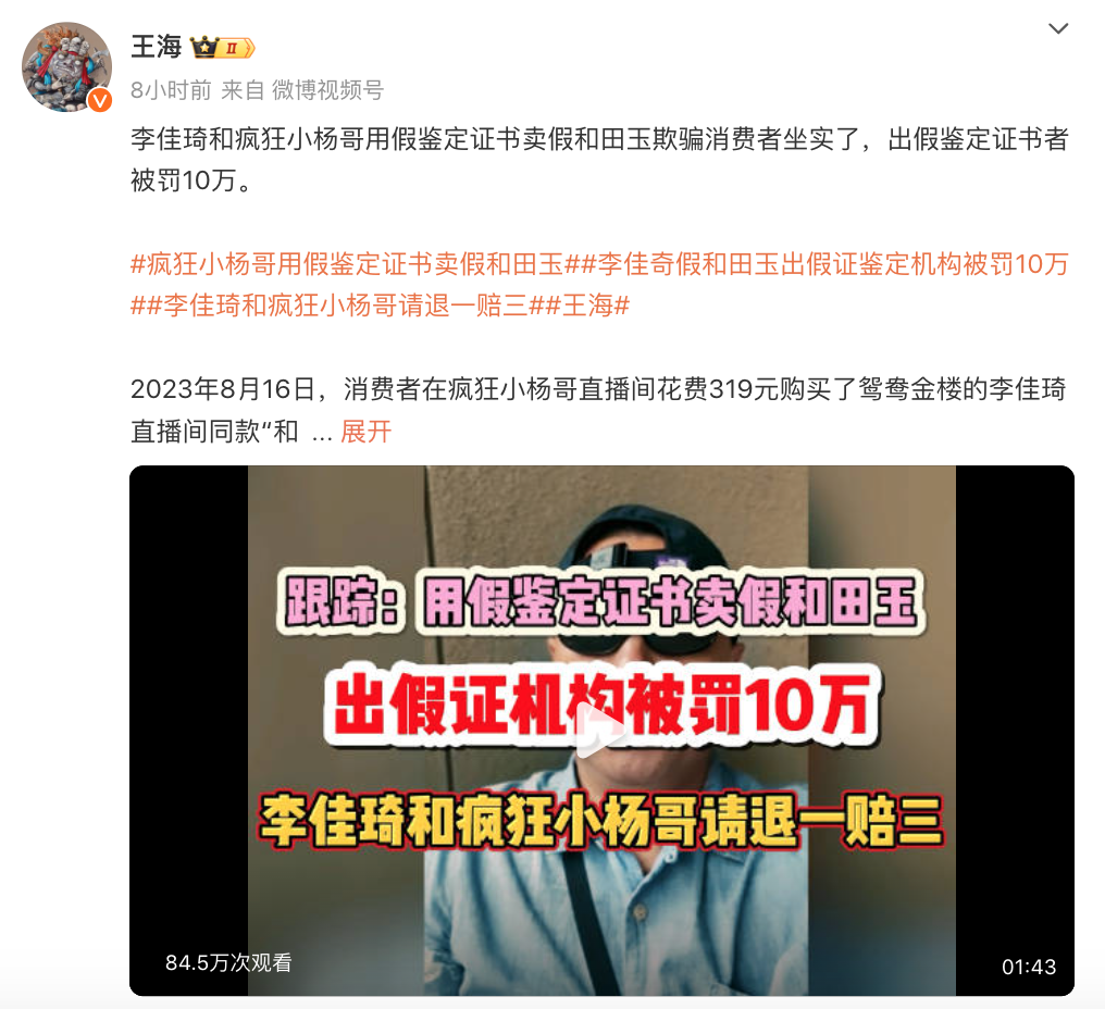 王海认为,这说明李佳琦和疯狂小杨哥用假鉴定证书卖假和田玉欺骗消费者坐实了。