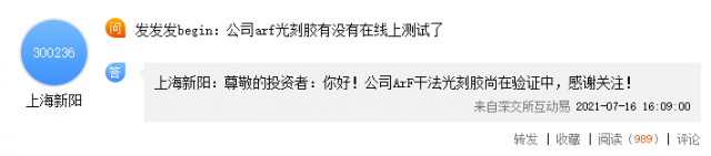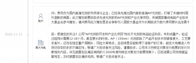 如果把南大光电的ArF光刻胶比作显卡,那么现在的情况就是几个厂家收到了这种显卡的样品并且测试了一下,其中两个厂家发布了比较正式的测评报告,其它厂家暂时没消息。这个显卡什么时候正式上架销售?不知道。也就是说很多厂家可能都没有收到过这个ArF光刻胶的样品。