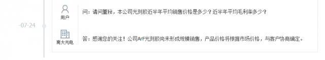 南大光电在近期与投资者互动时表示,“ArF光刻胶尚未形成规模销售,产品价格将根据市场价格,与客户协商确定。”也就是说南大光电的ArF光刻胶现在还不算是一个正式的商品。