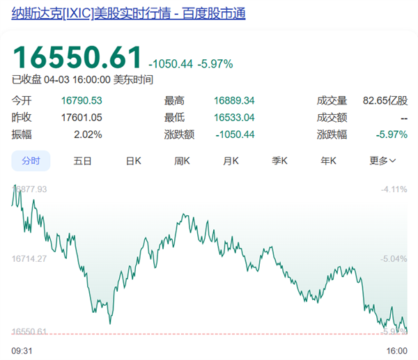 截至收盘,纳指暴跌5.97%,创2020年3月以来的最大跌幅;标普500指数暴跌4.84%,道指暴跌超1600点,跌幅达3.98%,同为2020年6月以来的最大单日跌幅,三大指数均创下了近五年来最大的单日跌幅。