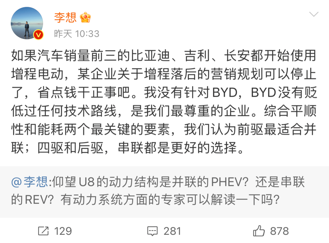 李想 Q 这个事儿无非就是想说,混动卖得这么好的比亚迪也来选择增程了, 你们还好意思说增程落后?