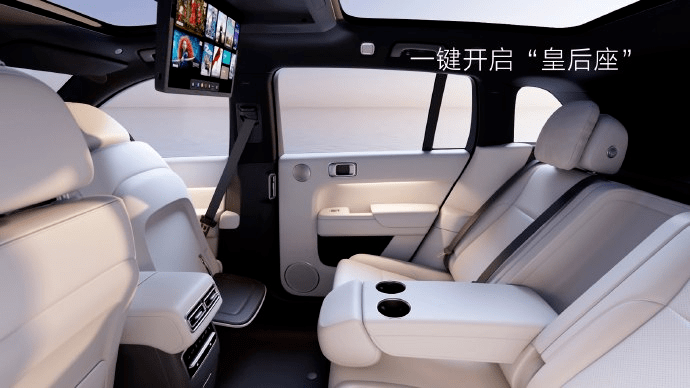 在理想 L7 这,女王变成了皇后,座位也移到了后排,直接在前排座椅的后方设计了电动脚托,上车就可以把脚搭着。