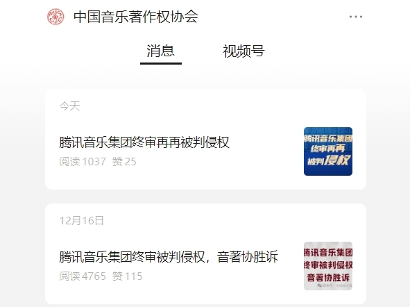 中国音乐著作权协会:腾讯音乐集团终审再被判侵权快讯