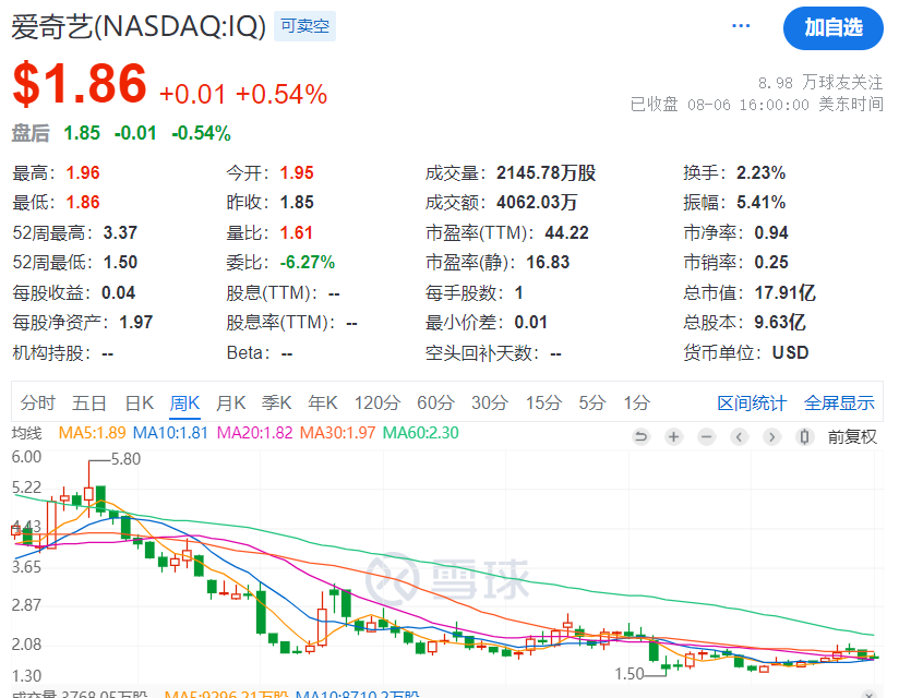 周三收盘,爱奇艺(NASDAQ:IQ)股价上涨0.54%至1.86美元,总市值约17.91亿美元。