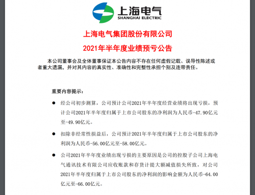 【TechWeb】8月17日晚,上海电气公告,上半年预计亏损47.9亿元-49.9亿元,扣非后预计亏损56亿元-58亿元,主要原因是公司的控股子公司上海电气通讯技术有限公司应收账款和存货计提大额减值损失所致。