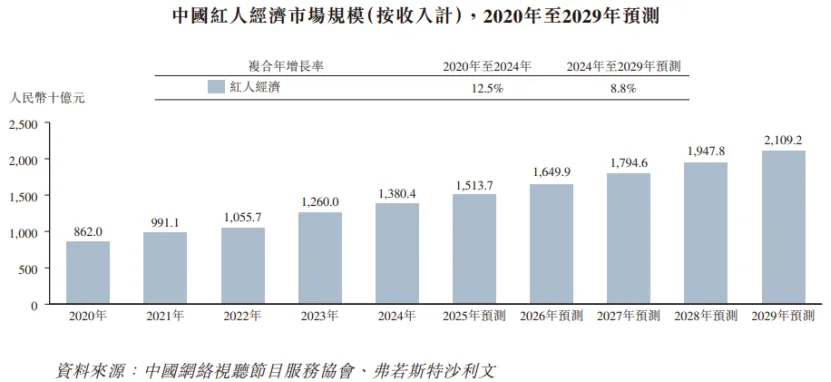 2024年中国红人经济规模约1.38万亿元,预计到2029年将扩大至2.11万亿元,2024年至2029年的复合年增长率为8.8%。