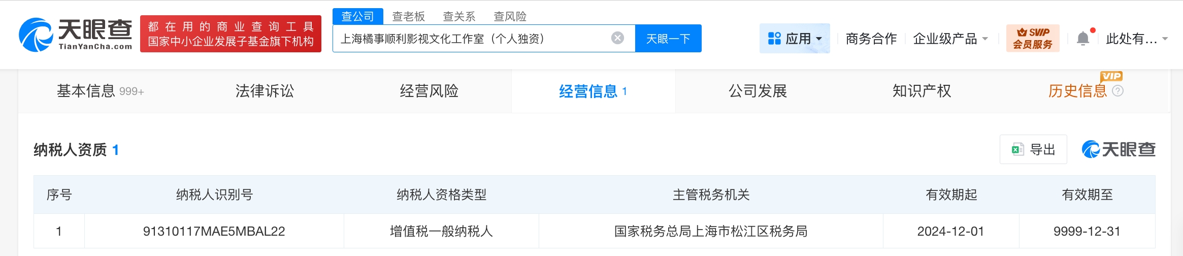 天眼查App显示,鞠婧祎名下共关联2家企业,分别为上海橘事顺利影视文化工作室(个人独资)、上海万事如祎影视文化工作室(个人独资),上述两家工作室均为鞠婧祎个人独资企业。值得一提的是,纳税人资质信息显示,上述两工作室均为增值税一般纳税人。