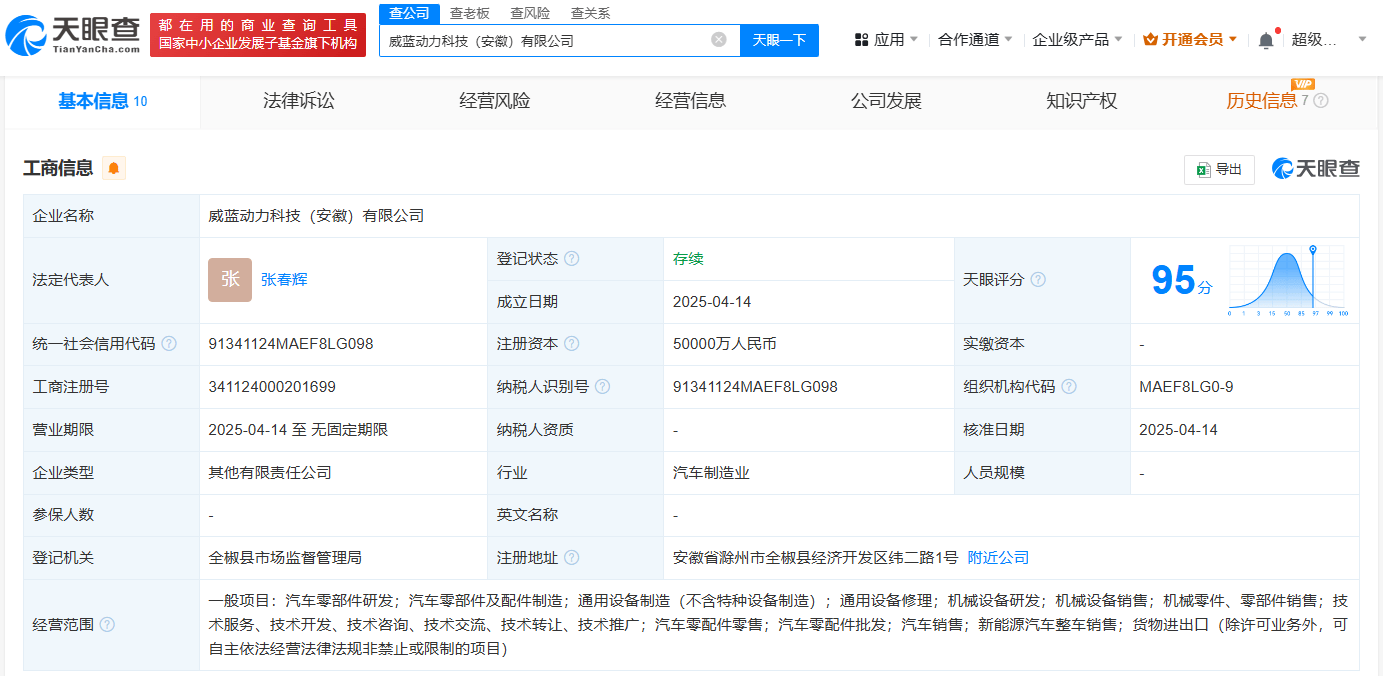 天眼查App显示,近日,威蓝动力科技(安徽)有限公司成立,法定代表人为张春辉,注册资本5亿人民币,经营范围包括汽车零部件研发、汽车零部件及配件制造、通用设备制造等。