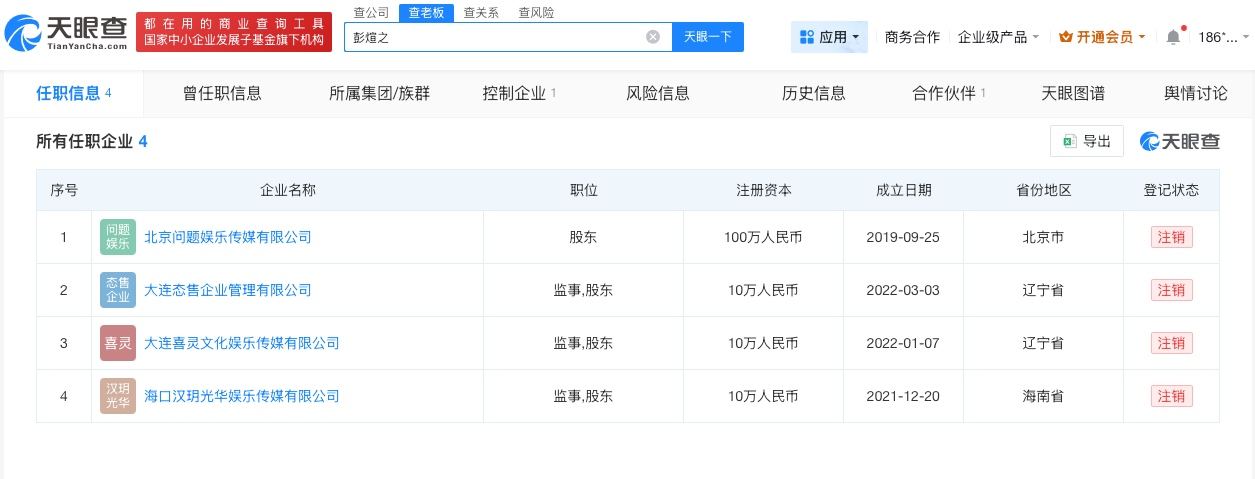 天眼查App显示,彭煊之(彭十六)关联的4家企业均已注销,包括北京问题娱乐传媒有限公司、大连态售企业管理有限公司等,涉及传媒、企业管理等领域,彭煊之(彭十六)在上述企业担任监事职务并持股。