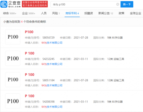 目前,企查查显示,华为公司于7月新注册2个P100商标。据悉,华为此前曾申请p10至p100商标。