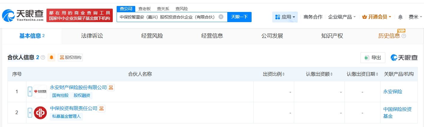 天眼查App显示,2月26日,中保投智星安(嘉兴)股权投资合伙企业(有限合伙)成立,执行事务合伙人为李一璟,出资额5亿人民币,经营范围为股权投资、创业投资,由永安财产保险股份有限公司、中保投资有限责任公司共同出资。