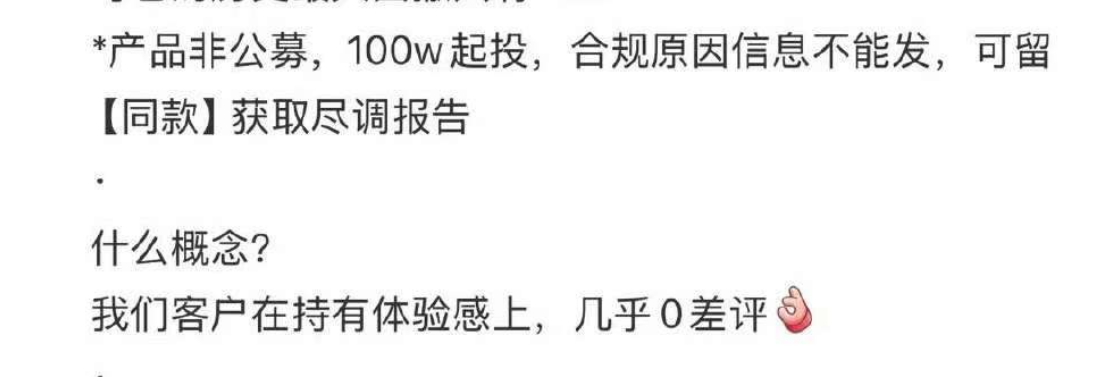 不仅如此,点开广告后内文宣传也充满“擦边球”的意味,文内大多隐晦表示“产品非公募”,并宣传“几乎0差评”等内容。从其所标注的“合规原因信息不能发”来看,很显然对方知道其所推销的产品不能公开推介。