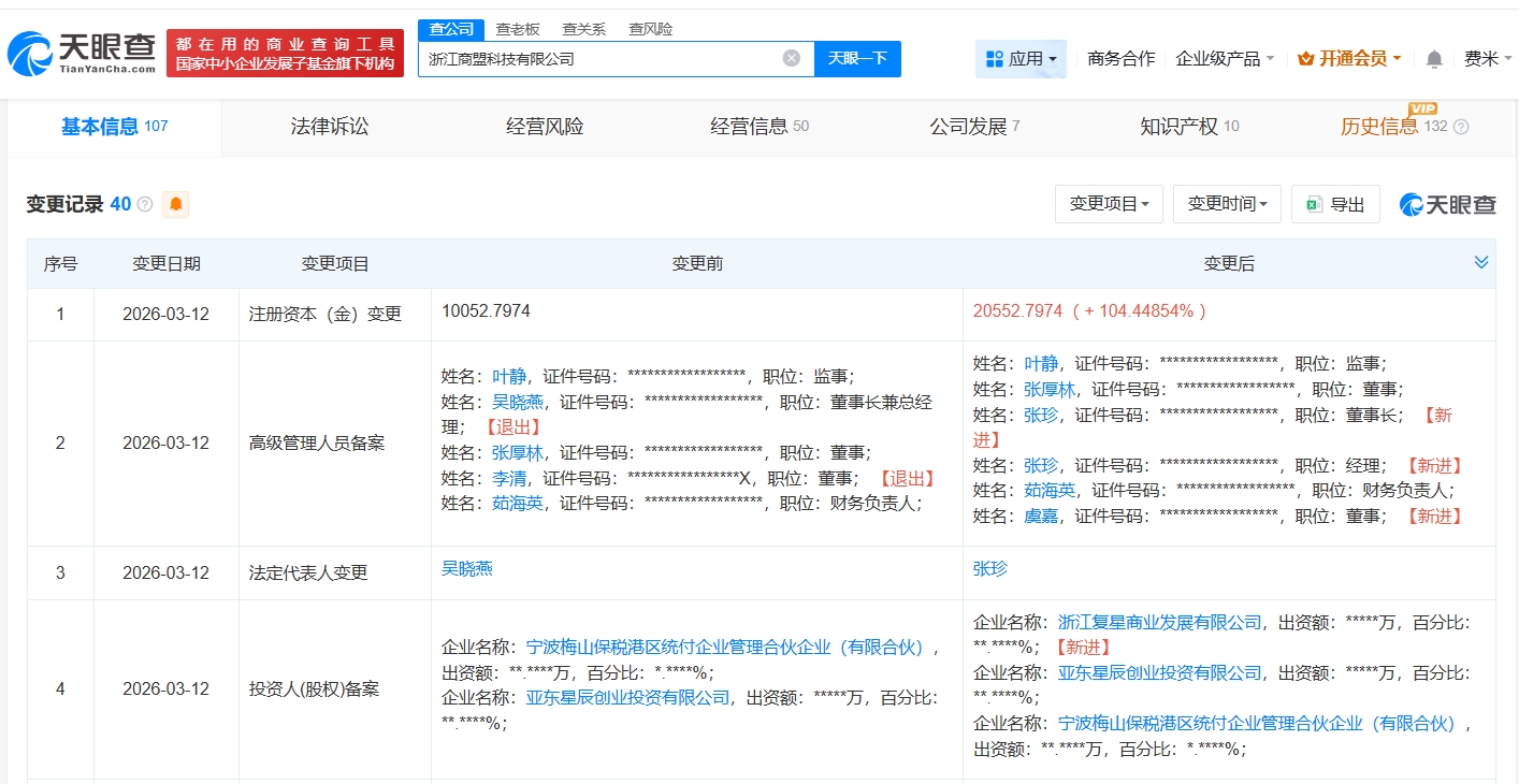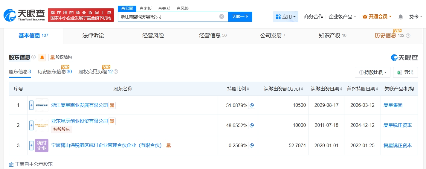 天眼查工商信息显示,近日,浙江商盟科技有限公司发生工商变更,新增复星集团旗下浙江复星商业发展有限公司为股东,注册资本由约1亿人民币增至约2.1亿人民币,增幅约104%,吴晓燕卸任法定代表人、董事长兼总经理,张珍接任法定代表人、董事长、经理。